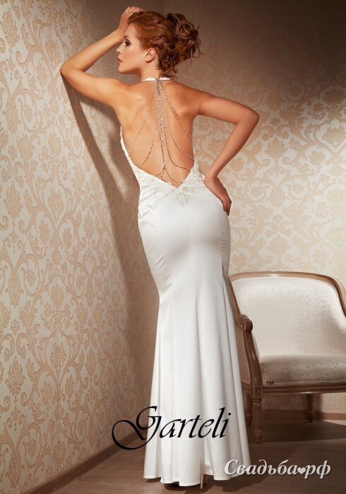 Роковым красавицам придётся по душе это свадебное платье от отечественного бренда Garteli. Атлас стрейтч помогает наряду отлично сесть по фигурке и подчеркнуть соблазнительные изгибы Вашего тела. Бретель-петля придаёт модели особый шарм. Открытая спина украшена сверкающими нитями. Облегающая юбочка облегает бёдра и струится до самого пола.