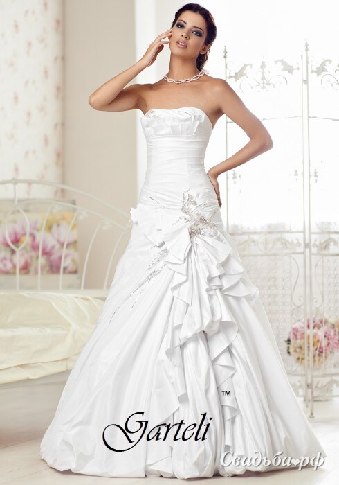 Роскошное платье от отечественного бренда Garteli выполнено из тафты. Наряд поражает оригинальными формами и высочайшим качеством. Заниженный корсет с лёгкой драпировкой зрительно увеличивает бюст и выгодно подчёркивает осиную талию невесты. Пышная юбка с объёмными сборками и необычным бантом украшена вышивкой. Вас точно заметят!