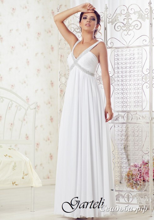 Шифоновое платье в греческом стиле – беспроигрышный вариант для романтичных красавиц. Хотите создать таинственный образ настоящей богини? Тогда эта модель придётся Вам по вкусу! Сверкающие бретели и V-образный вырез на груди привлекают внимание к бюсту. Длинная юбка с завышенной талией и множеством лёгких складок зрительно вытягивает силуэт.