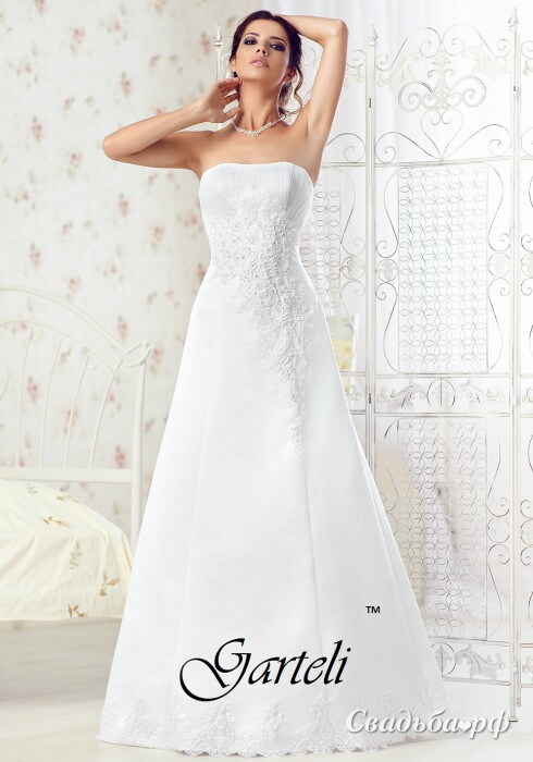 Классический свадебный наряд А-силуэта придётся по вкусу ценительницам элегантности и безупречного дизайна. Корсет с открытой зоной декольте и длинная юбка идеальной конусовидной формы идеально сочетаются друг с другом. По нижнему краю платьица и на корсаже расположилась тончайшая вышивка ручной работы и нежное кружево.