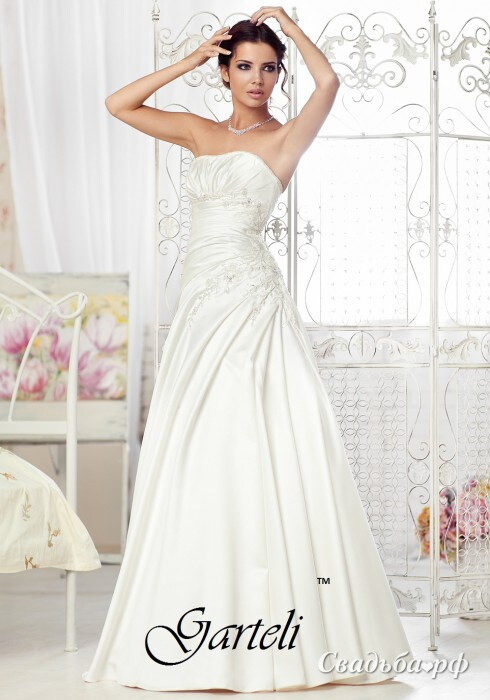 Шикарное свадебное платье из мягкого атласа не оставит равнодушной даже самую стильную невесту. Изюминкой этого А-силуэтного платья является оригинальная драпировка, зрительно увеличивающая бюст и выгодно подчёркивающая талию. Открытая зона декольте придаёт модели особый шик. Длинная юбка расширяется к полу. На боку расположилась вышивка.