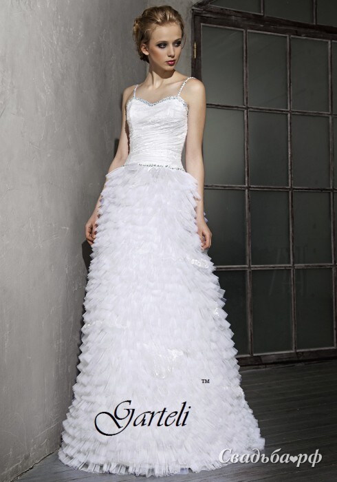 Самым юным и романтичным натурам придётся по вкусу этот наряд от отечественного бренда Garteli. Наряд выполнен из фатина и лёгкого кружева. Верхняя часть с тонкими бретелями и открытой зоной декольте украшена по краям сверкающей вышивкой. Расширяющаяся к полу юбка с многоярусными воланами смотрится оригинально и воздушно.