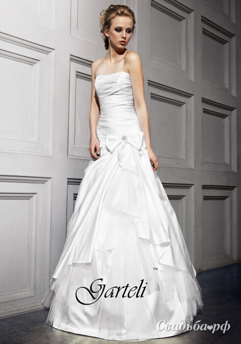 Атласный наряд от российского бренда Garteli подчеркнёт все прелести Вашей фигуры. Заниженный корсет с открытой зоной декольте и лёгкой драпировкой гармонично сочетается с оригинальной юбкой из нескольких слоёв разной по фактуре ткани. На бедре уютно разместился кокетливый бант. Стильный и свежий образ для настоящей модницы.