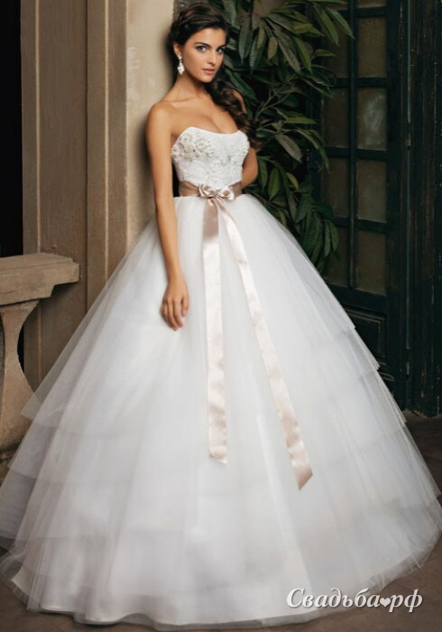 Очаровательное свадебное платье с расшитым вручную корсетом поможет создать поистине королевский образ. Неповторимый бант контрастного оттенка придает наряду особый шик и выгодно подчёркивает осиную талию невесты. Пышная юбка с несколькими слоями полупрозрачной ткани смотрится сногсшибательно. Открытая зона декольте привлекает к себе внимание.