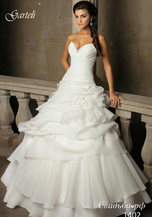 Роскошное свадебное платье от отечественного бренда Garteli поражает своими безупречными формами и стильным дизайном. Драпированный корсет с соблазнительным вырезом на груди украшен дорогой вышивкой ручной работы. Расширяющаяся к полу юбка дополнена несколькими ярусами воланов. На подоле расположились едва заметные объёмные цветы.