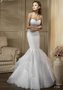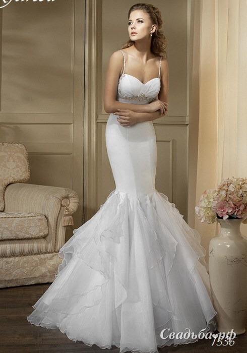 Мечтаете почувствовать себя владычицей морской? Тогда это свадебное платье силуэта Русалочка создано специально для Вас. Облегающий наряд от уровня колен переходит в пышную юбочку-хвост с полупрозрачными воланами. Открытая зона декольте с тонкими бретелями и пикантно оголённая спина придают образу соблазнительность. Бюст украшен вышивкой.