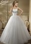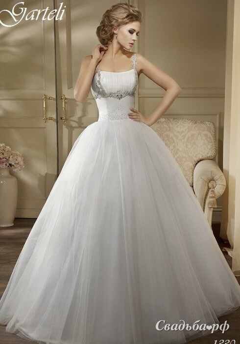 Восхитительный наряд с ярко выделенной грудью понравится роковым красоткам. Открытая зона декольте со сверкающими бретелями смотрится великолепно. Пышная юбка со множеством слоёв невесомой ткани придаёт образу неземную лёгкость и нежность. Классический А-силуэт наряда никого не оставит равнодушным: Вы будете подобны царице.