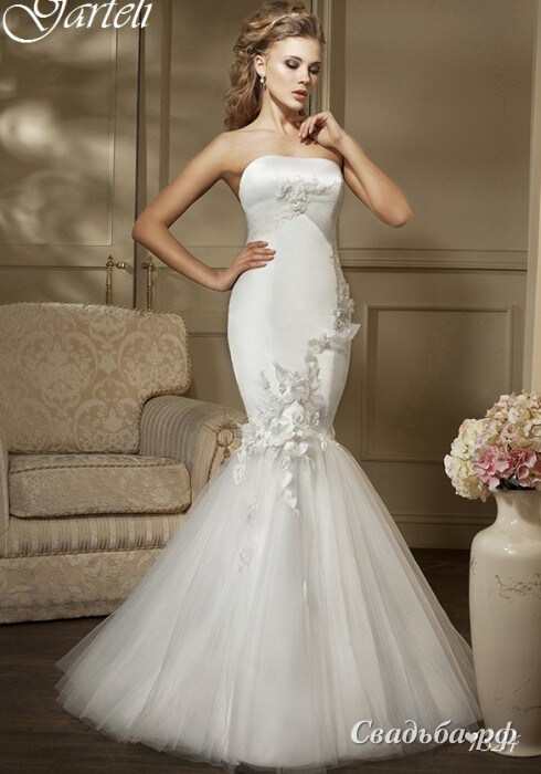 Потрясающее платье силуэта Русалочка словно переплетено невиданными цветами. Облегающий наряд с соблазнительной зоной декольте украшен объёмным декором. От уровня колен начинается пышная юбочка из лёгкого фатина. Такое свадебное платье нежно подчеркнёт все достоинства фигуры и мягко скроет её недостатки. Будьте на волне!