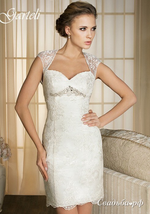 Очаровательная модель с кружевными плечиками и пикантно оголённой спинкой создано для самых кокетливых невест. Открытая зона декольте и сверкающая вставка под грудью акцентируют внимание на бюсте. Облегающий наряд едва доходит до середины бедра, благодаря чему Вы сможете показать свои прекрасные ножки и стильные туфельки.