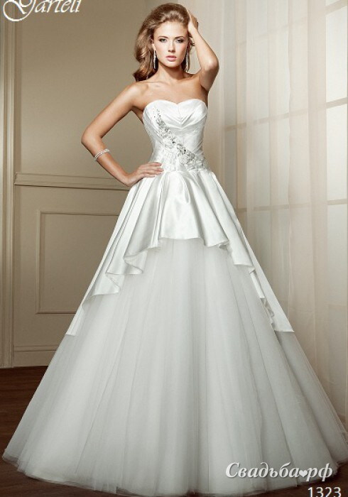 Роскошное сочетание атласного верха и фатиновой юбки придают этому свадебному платью неповторимый облик. Корсет с открытой зоной декольте украшен объёмными цветами. Модель подчёркивает осиную талию невесты и зрительно увеличивает бюст. В таком стильном наряде от именитого бренда Garteli вы будете подобны прекрасной королеве.