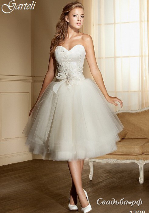 Свадебное платье от известного бренда Garteli никого не оставит равнодушным. Очаровательный корсет с оголённой зоной декольте и плавным верхним краем вручную расшит бисером. Талия украшена объёмным цветком. Пышная юбочка из множества слоёв невесомой ткани спускается чуть ниже уровня колен, БЛАГОДАРЯ ЧЕМУ Вы сможете блеснуть своими ножками.