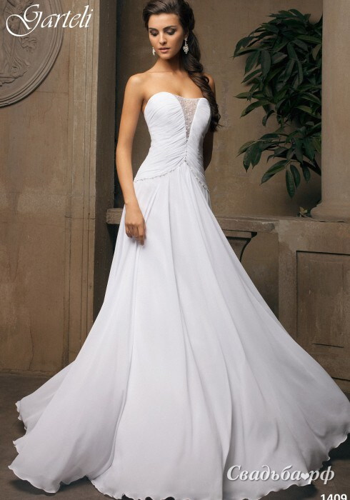 Невесомое платье от лучших отечественных дизайнеров выполнено из тончайшей ткани. Драпированный корсет с пикантно оголённой зоной декольте и полупрозрачной вставкой на груди вручную расшит сверкающими пайетками. Лёгкая, словно облако, юбочка свободного покроя струится до самого пола. Нежный образ из новой коллекции 2014 года.