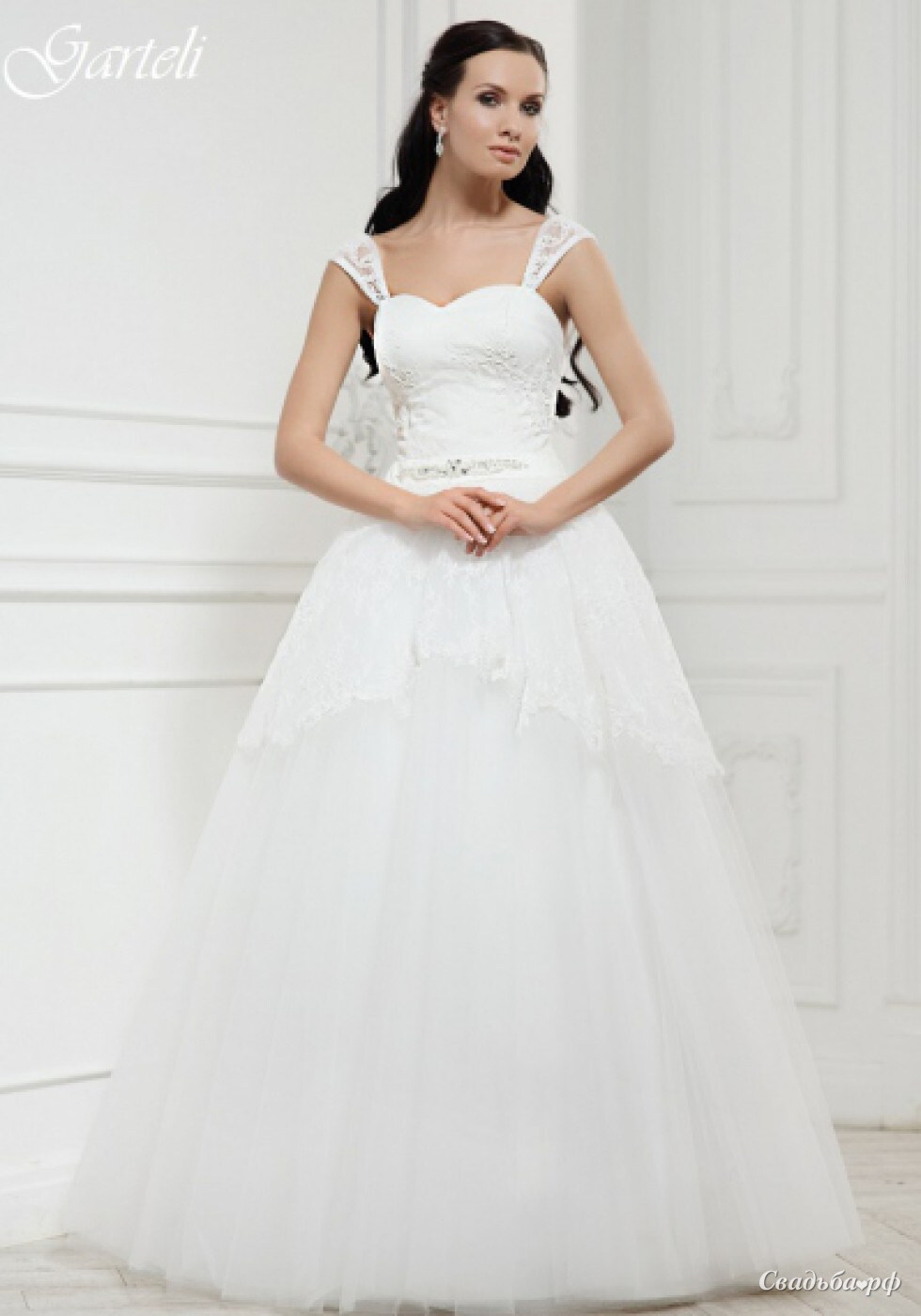 Изысканное свадебное платье с широкими кружевными бретелями. Корсет с фигурным лифом полностью покрыт тонким кружевом с нежными ажурными узорами. Линия талии эффектно выделена узким пояском, расшитым стразами и бисером. Верхний короткий слой пышной фатиновой юбки также выполнен из кружева, что делает образ ещё более романтичным.