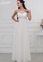 Великолепное струящееся свадебное платье с завышенной линией талии. Зона декольте кокетливо прикрыта полупрозрачной тканью с изумительно красивой вышивкой из сверкающих стразов. Лиф задрапирован мягкими складами. По линии талии проходит пояс, также расшитый стразами. Мягкая юбка спокойно струится вдоль фигуры и ниспадает на пол.