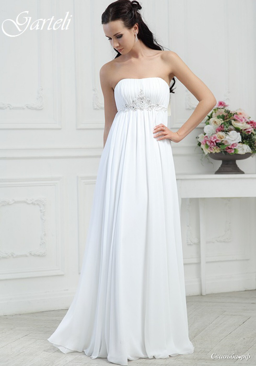 Свадебное платье для невест, которые любят греческий стиль. Мягкая драпировка украшает открытый лиф и плавно переходит в склады длинной струящейся юбки. Великолепная, вышитая бисером и сверкающими стразами композиция расположена под грудью на завышенной линии талии. Настолько изысканный наряд достоин настоящей королевы свадебного бала.