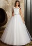 Шикарное свадебное платье классического А-силуэта поможет создать сногсшибательный образ современной принцессы. Зона декольте закрыта полупрозрачной вставкой. Талия подчёркнута сверкающим поясом. Корсет украшен тончайшим узором. Пышная юбка из невесомого фатина подобна лёгкому облаку. Романтичный наряд из коллекции 2015 года.