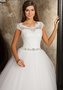 Очаровательный свадебный наряд представлен в свежей коллекции Весна 2015. Платье выполнено из тонкого кружева и воздушного фатина. Полупрозрачная вставка на груди и небольшие рукавчики помогают создать воздушный и невинный образ. Талия расшита бисером и стразами. Пышная юбка подобна лёгкому облаку. Наряд подчёркивает достоинства фигуры.