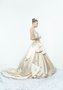 Сногсшибательное платье от известного дизайнера Веры Калининой способно удовлетворить даже самую притязательную модницу. Модель выполнена из благородного атласа-дюпона нежного кремового оттенка. Расшитый вручную корсет с открытой зоной декольте гармонично сочетается с пышной юбкой и шлейфом. Наряд дополнен крупным бантом на боку.