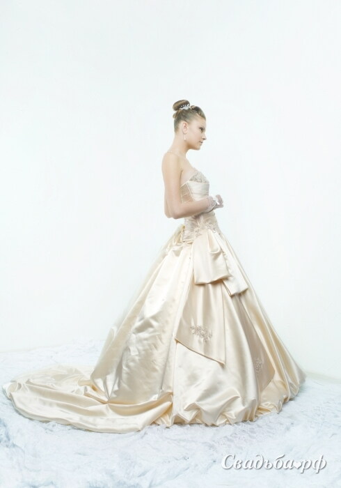 Сногсшибательное платье от известного дизайнера Веры Калининой способно удовлетворить даже самую притязательную модницу. Модель выполнена из благородного атласа-дюпона нежного кремового оттенка. Расшитый вручную корсет с открытой зоной декольте гармонично сочетается с пышной юбкой и шлейфом. Наряд дополнен крупным бантом на боку.