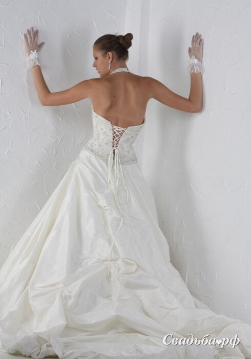 Роскошное свадебное платье от известных итальянских дизайнеров придётся по вкусу даже самым притязательным модницам. Плотный корсет с бретелью через шею украшен ручной вышивкой. Модель дополнена удобной шнуровкой на спине. Пышная юбка с королевским шлейфом выполнена из тафты. В таком наряде вы будете в центре внимания.