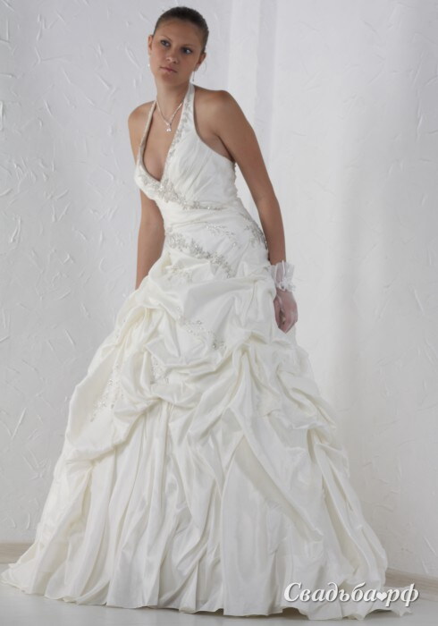 Великолепное свадебное платье от лучших итальянских мастеров отличается высочайшим качеством и безупречными формами. Элегантный корсет украшен искусной вышивкой. Глубокий V-образный вырез обрамлён широкими бретелями через шею. Эффектная юбочка с объёмными сборками драпировки придаёт образу воздушность.