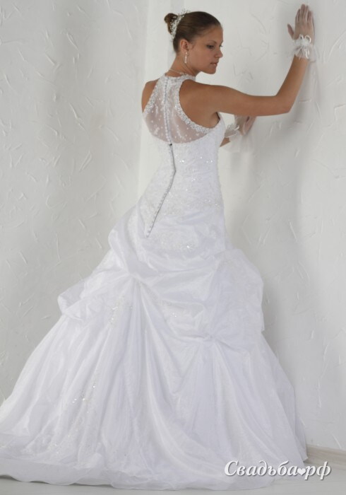 Роскошное свадебное платье итальянского производства никого не оставит равнодушным. Эта стильная модель с полупрозрачной вставкой на спине выгодно подчёркивает все соблазнительные изгибы фигуры. Платье вручную расшито хрусталём и бисером. От середины бедра юбка начинает расширяться. Подол наряда украшен объёмными сборками.