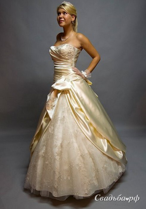 Эффектное свадебное платье с открытой зоной декольте создано для самых дерзких невест. Верхняя часть элегантного корсета вручную расшита бисером. Оригинальная драпировка пышной юбки приоткрывает спереди подъюбник из кружева. Крупный бант и объёмные сборки атласа-дюпонта придают наряду особую торжественность.