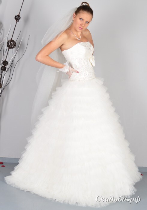 Если вы мечтаете почувствовать себя настоящей принцессой, то свадебное платье от Веры Калининой создано специально для вас. Роскошный корсет с открытой зоной декольте и кокетливым бантом под грудью вручную расшит бисером и стеклярусом. Многоярусная юбка из невесомого фатина придаёт наряду воздушность и свежесть.