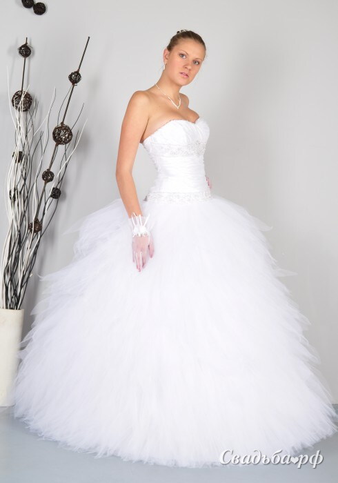Белоснежное свадебное платье от известного российского дизайнера Веры Калининой создано для настоящих принцесс. Элегантный корсет с открытой зоной декольте украшен кружевными полосками и искусной вышивкой ручной работы. Пышная юбочка с оригинальными фатиновыми перьями придаёт образу невесомость и свежесть.