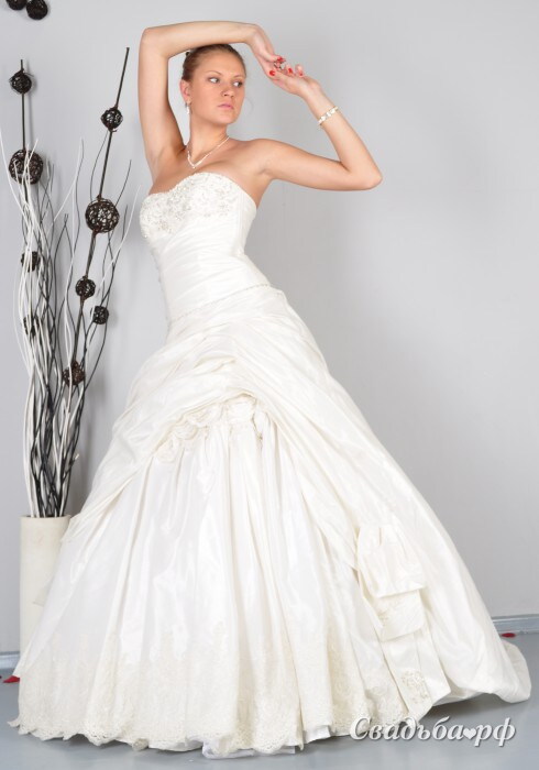 Изысканное свадебное платье от талантливого дизайнера Веры Калининой выполнено из шёлковой тафты. Верхний край драпированного корсета украшен ручной вышивкой. Наряд зрительно увеличивает бюст и выгодно подчёркивает талию. Пышная юбка с многочисленными сборками и складками декорирована кружевной вставкой.