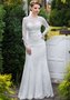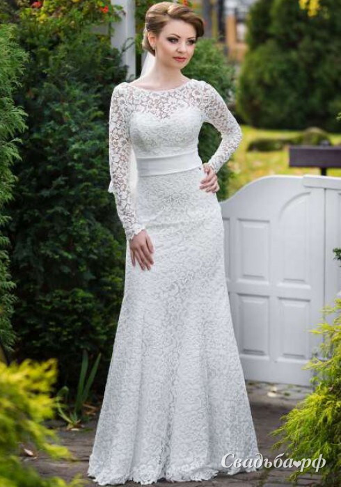 Стильное платье силуэта русалка полностью выполнено из гипюра. Скромный округлый вырез выглядит очень элегантно и сдержанно. Длинные рукава соблазнительно обтягивают изящные руки. Широкий гладкий пояс эффектно выделяет линию талии. Романтичная, расширенная книзу юбка визуально удлиняет силуэт и делает образ ещё более утончённым изысканным.