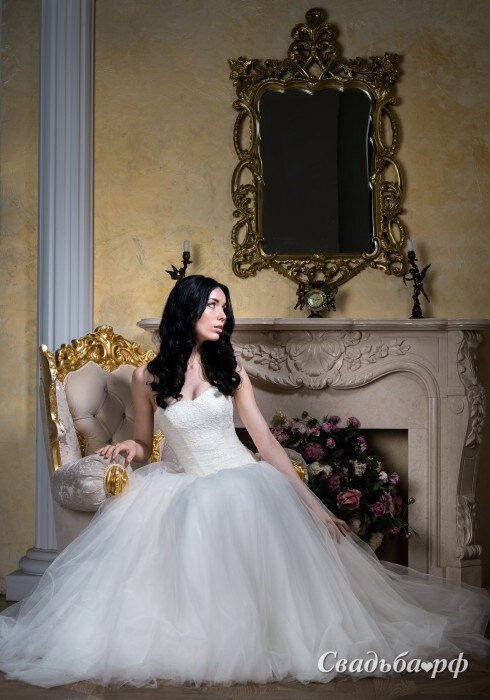 Классическое пышное свадебное платье с кружевным лифом и шлейфом. Соблазнительно открытый фигурный лиф полностью обтянут изысканным кружевным полотном с удивительно красивыми ажурными узорами. Сзади расположена удобная шнуровка из атласной ленты. Пышная юбка громадным облаком окутывает фигурку невесты и плавно переходит в роскошный шлейф.