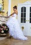 Оригинальное свадебное платье с необычной пышной юбкой. Открытый лиф и удлинённый корсет модели обтянуты ажурным кружевом с удивительно красивыми узорами. Короткая спереди и длинная сзади юбка смотрится кокетливо, игриво и романтично одновременно. Такая юбка предоставляет невесте прекрасную возможность продемонстрировать свои стройные ножки.