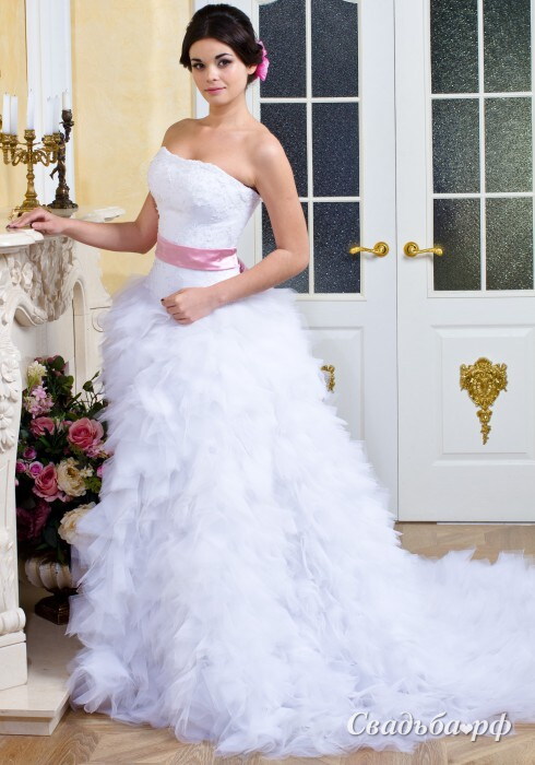 Шикарное свадебное платье с длинной пышной юбкой и шлейфом. Юбка из фатиновых кусочков, выполненных в виде перьев, невесомым облаком окутывает ножки невесты и мягко ниспадает на пол, превращаясь в романтичный шлейф. На кружевном лифе по линии талии проходит пояс контрастного цвета, сзади завязывающийся в бант. На спине – удобная шнуровка.