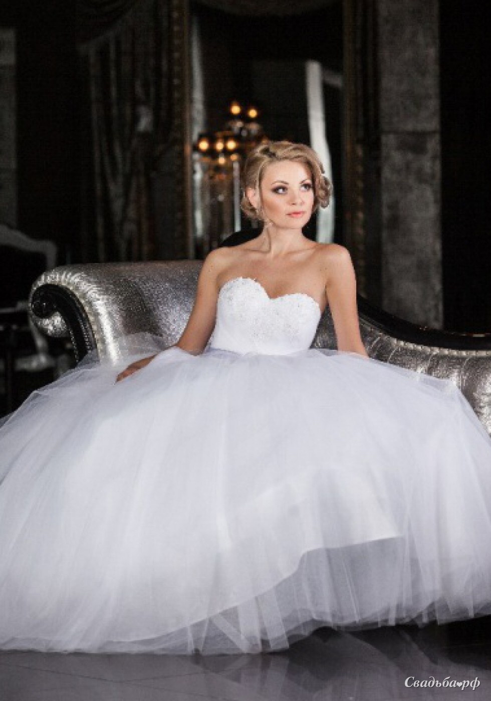 Поистине королевское свадебное платье от именитого отечественного дизайнера Веры Калининой выполнено из нежного кружева и евросетки. Пышная юбка дополнена шлейфом. Кружевной лиф с соблазнительно оголённой зоной декольте вручную расшит сверкающим стеклярусом и бисером. Это восхитительное платье А-силуэта выгодно подчёркивает талию и бюст.