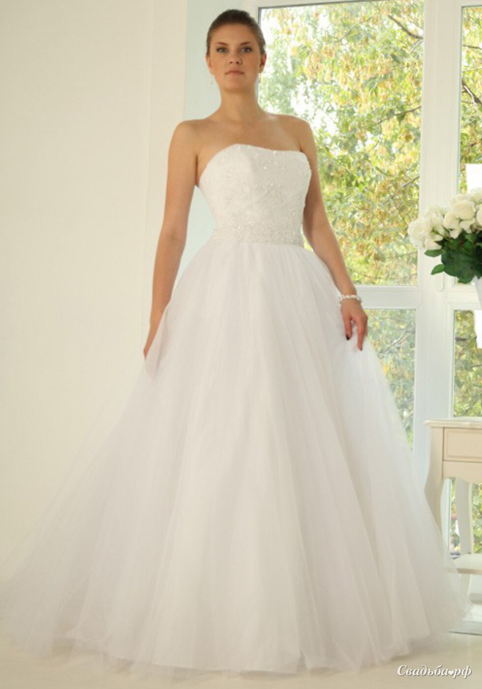 Шикарное пышное платье с кружевным лифом расшитым стеклярусом и шлейфом юбки.