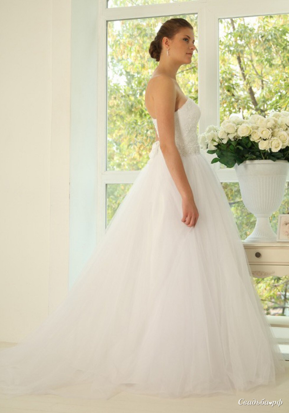 Пышное платье со шлейфом и расшитым кружевным лифом.