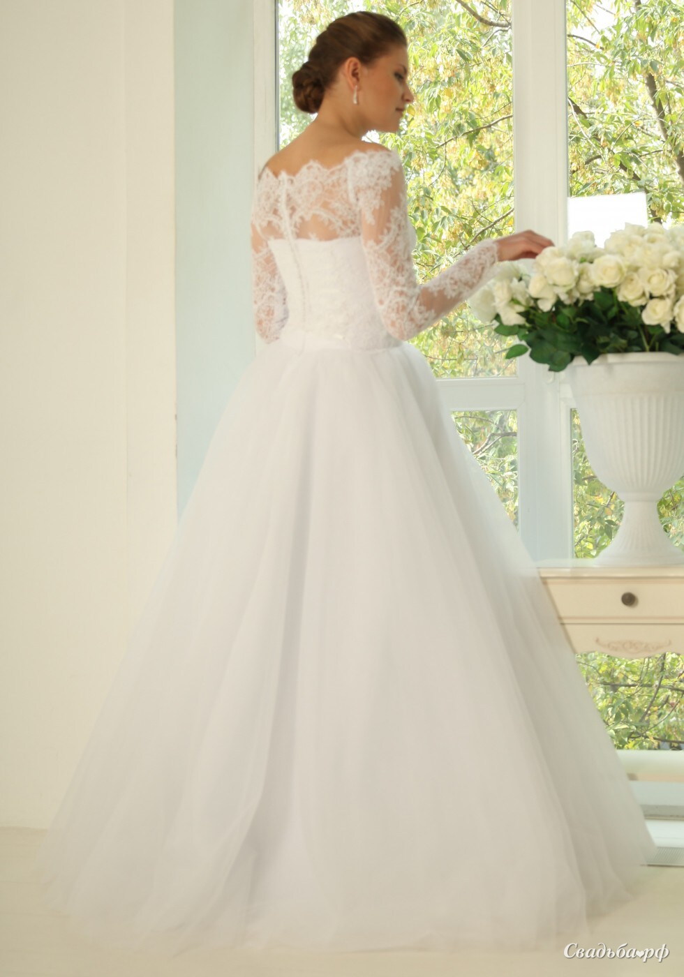 Платье из нежного фатина с болеро, застегивающимся сзади на пуговички.