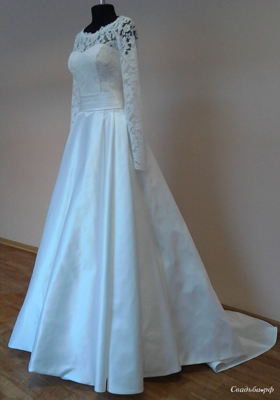 Классическое атласное платье со шлейфом и кружевным лифом и длинными рукавами.
