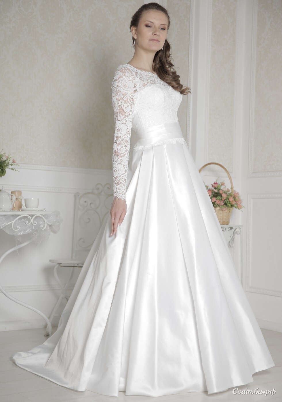 Стильное платье с кружевным лифом и длинными кружевными рукавами. С небольшим шлейфом.