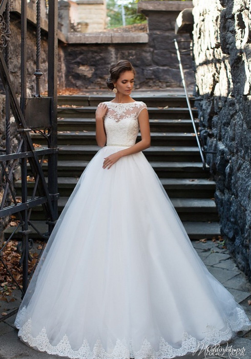 Нежное платье с пышной юбкой с отделкой по низу юбки и расшитым кружевным лифом.