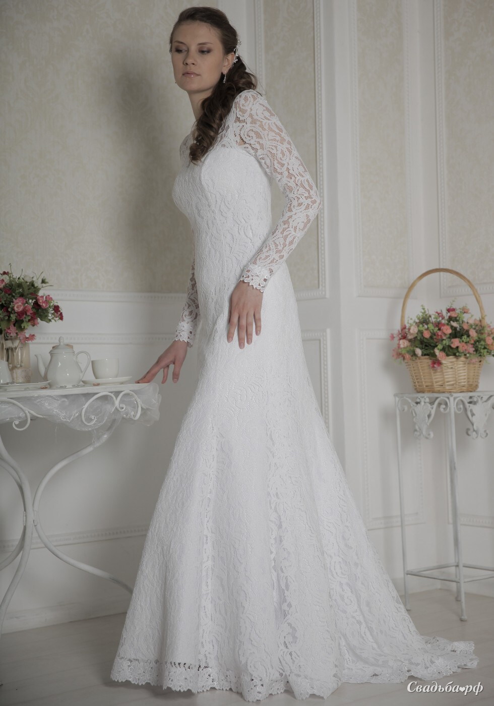 Платье силуэта Русалка с небольшим шлейфом и длинными рукавами.