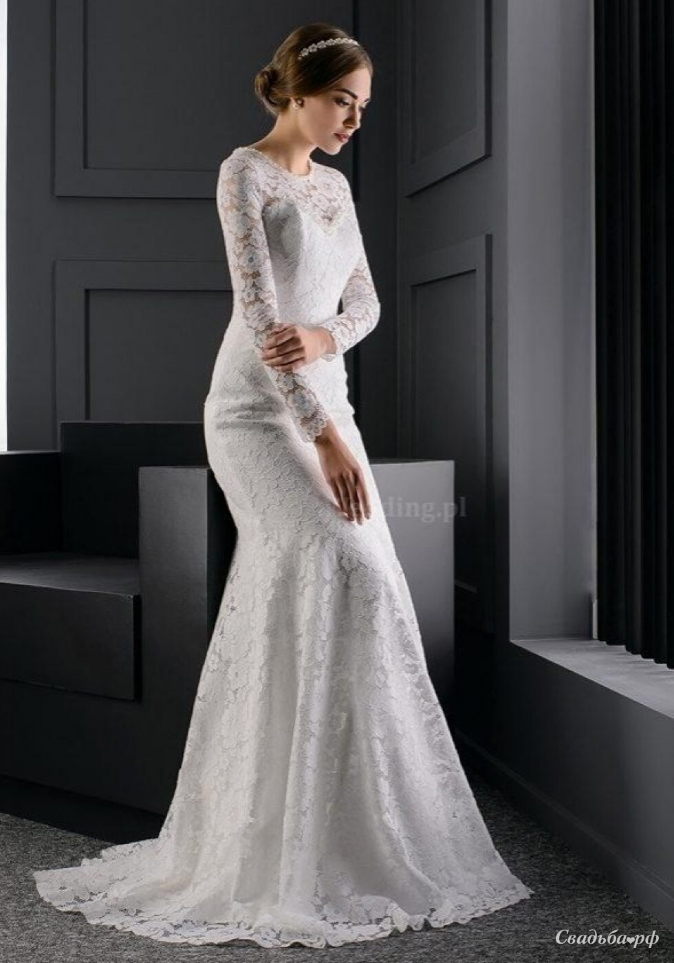 Платье силуэта Русалка из кружева с длинными рукавами и небольшим шлейфом.
