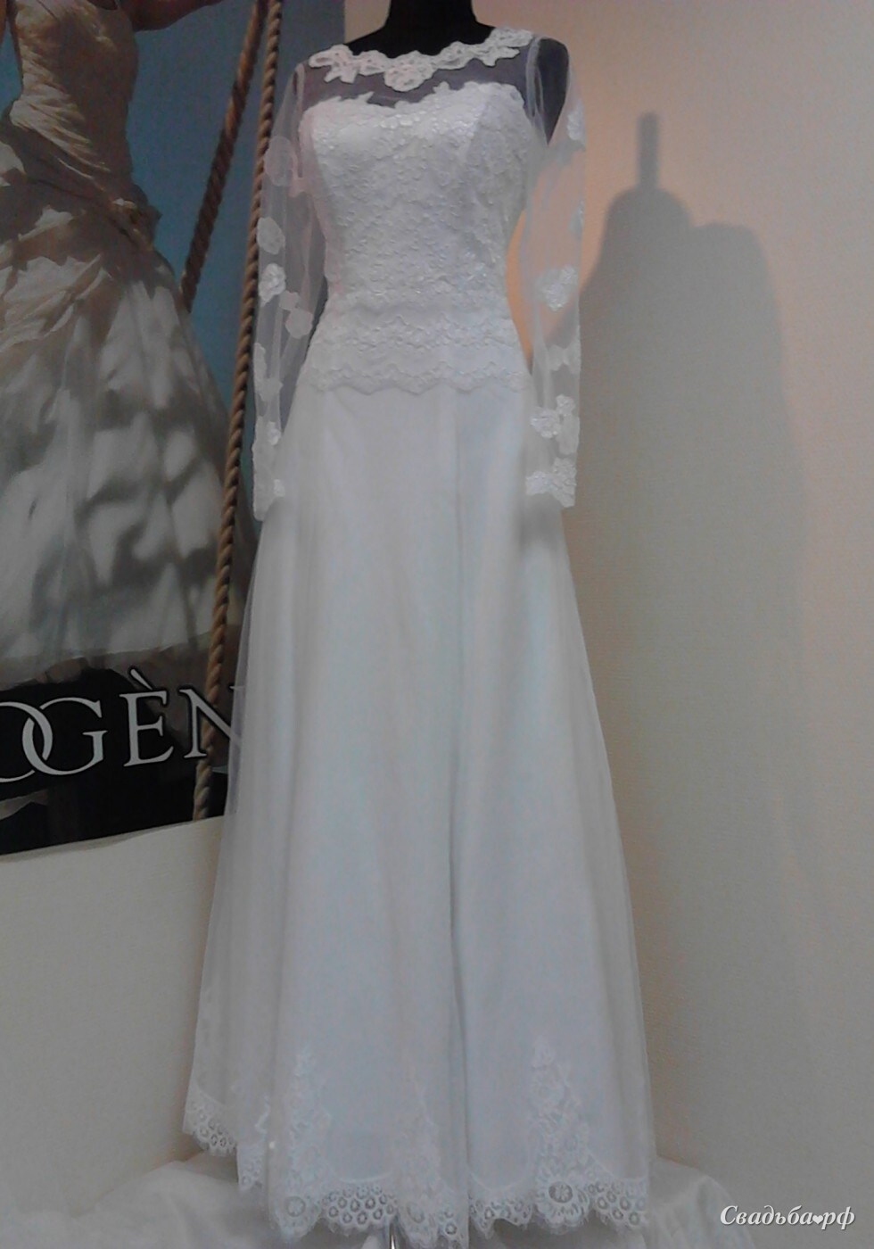 Свадебное платье с кружевным лифом и длинными рукавами, непышное, А-силуэта с кружевной отделкой по низу юбки.