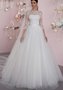 Классическое свадебное платье с пышной юбкой и тонким кружевом шантильи на лифе и рукавами 3/4 из кружева.