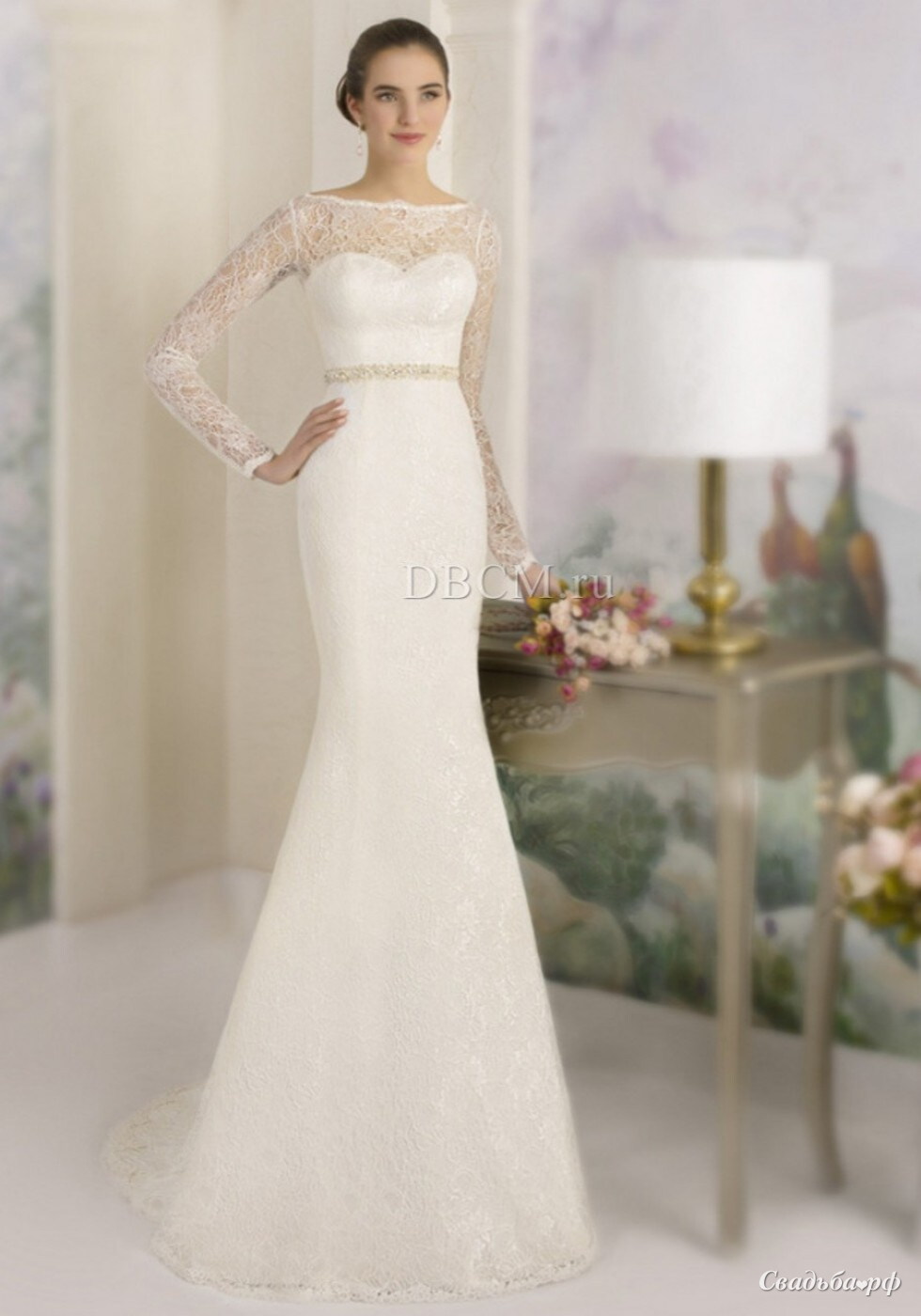 Платье силуэта Русалка из нежного и тонкого кружева Шантильи с длинными рукавами и небольшим шлейфом .