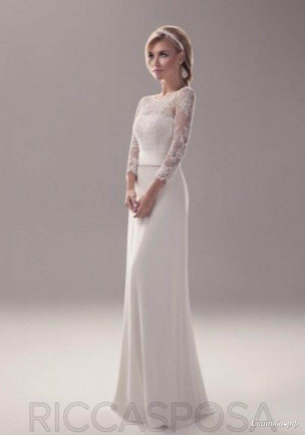 Нежное платье с кружевным лифом и длинными рукавами из кружева шантильи и легкая шифоновая юбка с небольшим шлейфом.