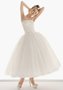Пышное платье с кружевным лифом и драпировкой на груди, юбка ниже колена.
