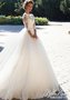 Нежное свадебное платье с кружевным лифом, рукавами 3/4 и пышной юбкой из евросетки, по краю отделанной кружевами.