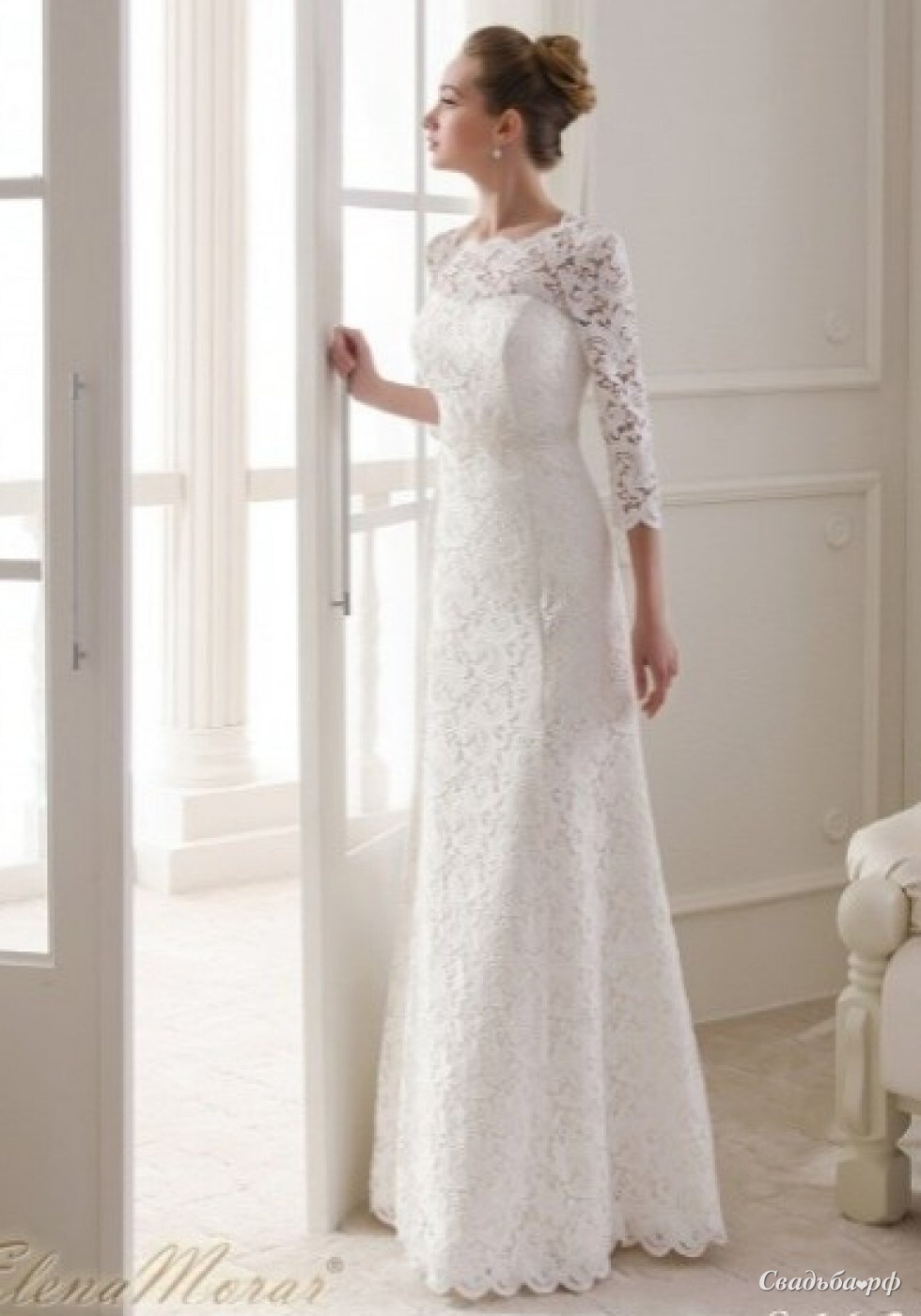 Классическое платье из кружева силуэта Русалка с рукавами чуть ниже локтя и небольшим шлейфом. Подчеркивает линию талии пояс, декорированный вышивкой. Прекрасно подойдет для венчания.